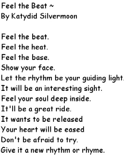 Advice Poetry Angels and Fairies Poetry Love Poetry Miscellaneous Poetry Pagan Poetry Feel the Beat by Katydid Silvermoon Feel the beat. Feel the heat. Feel the base. Show your face. Let the rhythm be your guiding light. It will be an interesting sight. Feel your soul deep inside. It'll be a great ride. It wants to be released Your heart will be eased Don't be afraid to try. Give it a new rhythm or rhyme.