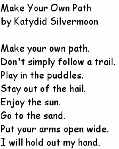 Advice Poetry Angels and Fairies Poetry Love Poetry Miscellaneous Poetry Pagan Poetry Make Your Own Path by Katydid Silvermoon Make your own path. Don't simply follow a trail. Play in the puddles. Stay out of the hail. Enjoy the sun. Go to the sand. Put your arms open wide. I will hold out my hand.