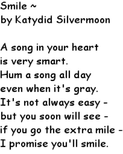 Advice Poetry Angels and Fairies Poetry Love Poetry Miscellaneous Poetry Pagan Poetry Smile by Katydid Silvermoon A song in your heart is very smart. Hum a song all day even when it's gray. It's not always easy - but you soon will see - if you go the extra mile - I promise you'll smile.