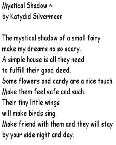 Advice Poetry Angels and Fairies Poetry Love Poetry Miscellaneous Poetry Pagan Poetry Mystical Shadow by Katydid Silvermoon The mystical shadow of a small fairy make my dreams no so scary. A simple house is all they need to fulfill their good deed. Some flowers and candy are a nice touch. Make them feel safe and such.. Their tiny little wings will make birds sing. Make friend with them and they will stay by your side night and day.