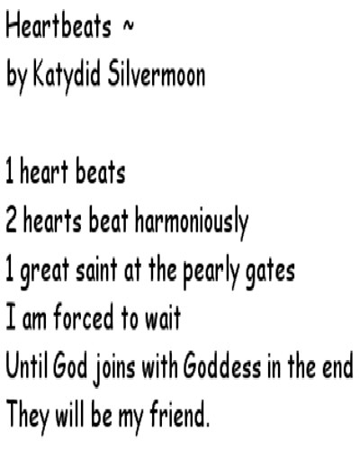Advice Poetry Angels and Fairies Poetry Love Poetry Miscellaneous Poetry Pagan Poetry Heartbeats by Katydid Silvermoon 1 heart beats 2 hearts beat harmoniously 1 great saint at the pearly gates I am forced to wait Until God joins with Goddess in the end They will be my friend.