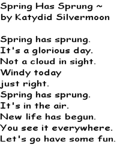 Advice Poetry Angels and Fairies Poetry Love Poetry Miscellaneous Poetry Pagan Poetry Spring Has Sprung by Katydid Silvermoon Spring has sprung. It's a glorious day. Not a cloud in sight. Windy today just right. Spring has sprung. It's in the air. New life has begun. You see it everywhere. Let's go have some fun.