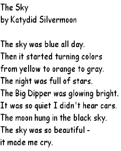 Advice Poetry Angels and Fairies Poetry Love Poetry Miscellaneous Poetry Pagan Poetry The Sky by Katydid Silvermoon The sky was blue all day. Then it started turning colors from yellow to orange to gray. The night was full of stars. The Big Dipper was glowing bright. It was so quiet I didn't hear cars. The moon hung in the black sky. The sky was so beautiful - it made me cry.